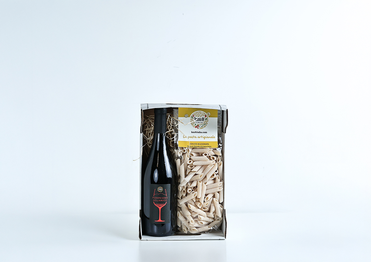 Contiene 1 pacco di pasta artigianale trafilata al bronzo e 1 bottiglia di vino a scelta tra il corposo Aglianico Pompeiano e la delicata Catalanesca del Monte Somma.